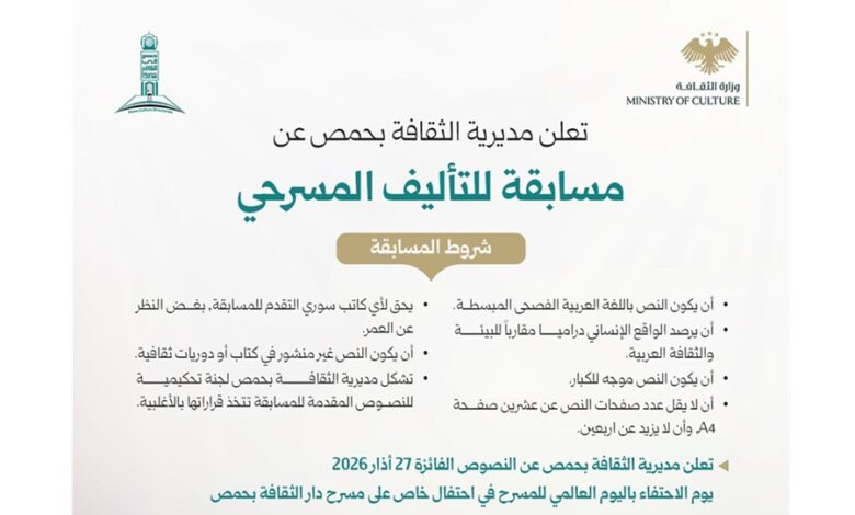 أعلنت مديرية الثقافة في محافظة حمص عن إطلاق مسابقة للتأليف المسرحي، في خطوة تهدف إلى دعم الطاقات الإبداعية في مجال الكتابة المسرحية، وتشجيع النصوص التي تعكس الواقع الإنساني والاجتماعي برؤية درامية عميقة.
