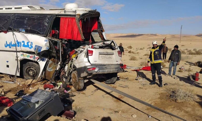 توفي خمسة أشخاص وأصيب ستة آخرون، اليوم الثلاثاء، جراء تصادم سيارة مع حافلة نقل على طريق تدمر – دير الزور قرب بلدة السخنة.