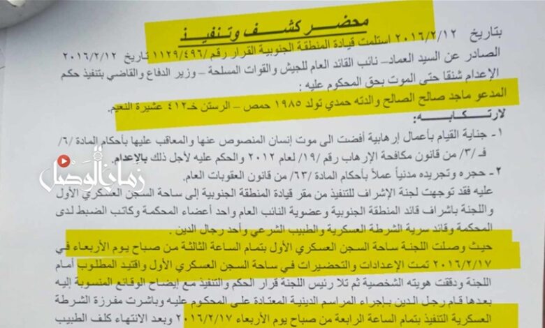 حصلت “زمان الوصل” على أول وثيقة رسمية مفصّلة تُثبت تنفيذ حكم إعدام داخل سجن صيدنايا، بحق المعتقل ماجد صالح أحمد صالح، من مواليد 1985 – حمص، بتاريخ 17 شباط/فبراير 2016.