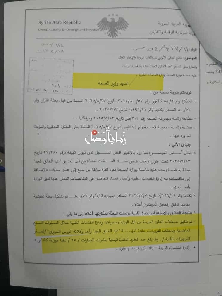 المنظمة اتفقت على تنفيذ المشروع مع شركة “المجموعة الطبية” التابعة لعبد الخالق العبد، المعروف بتورطه في عقود مزوّرة وسرقة عشرات المليارات، وفق تقرير الهيئة العامة للرقابة والتفتيش الصادر بتاريخ 18/9/2025، حتى أن وزارة الصحة السورية أوقف التعامل المالي معه حتى انتهاء التحقيق.