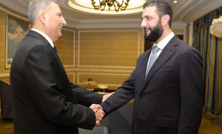 وفي إطار اللقاءات الرسمية والشخصية خلال مشاركته في منتدى الدوحة، التقى الرئيس الشرع، أمير دولة قطر الشيخ تميم بن حمد آل ثاني على هامش المنتدى، بحضور وزير الخارجية والمغتربين أسعد الشيباني،