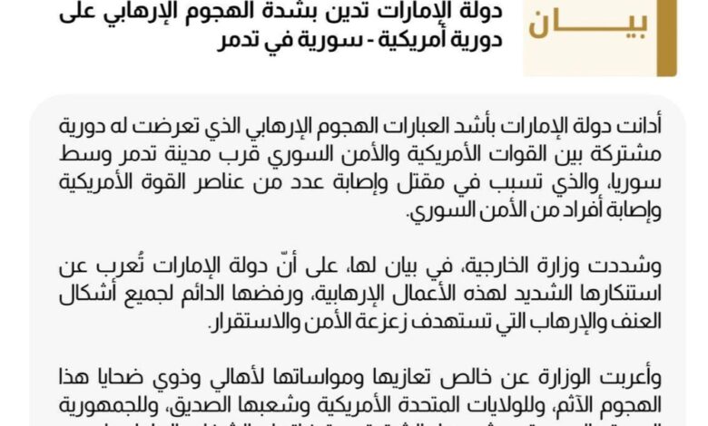 الإمارات تدين الهجوم الإرهابي على الدورية الأمريكية – السورية في مدينة تدمر