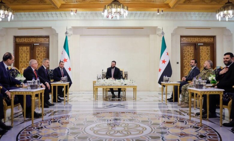 وحضور اللقاء وزير الخارجية والمغتربين أسعد الشيباني ووزير الدفاع مرهف أبو قصرة ورئيس جهاز الاستخبارات العامة حسين السلامة.