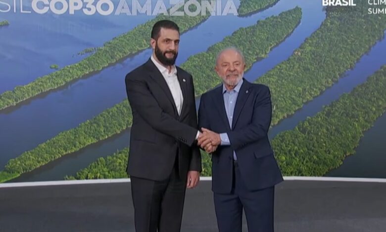 واستقبل الرئيس البرازيلي لويس إيناسيو لولا دا سيلفا، الرئيس الشرع في قاعة انعقاد قمة المناخ في مدينة بيليم.