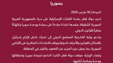 أعربت دولة قطر عن إدانتها الشديدة للغارات الجوية التي شنتها إسرائيل على محافظة درعا في جنوب سوريا، معتبرةً أنها انتهاك…