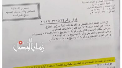 حصلت “زمان الوصل” على وثيقة رسمية صادرة عن “القيادة العامة للجيش والقوات المسلحة – وزارة الدفاع”، تؤكد تنفيذ حكم الإعدام…